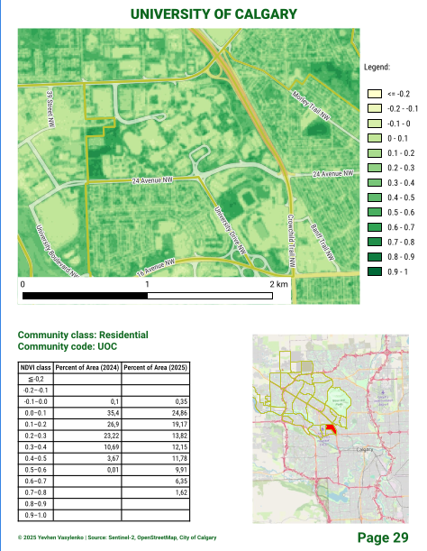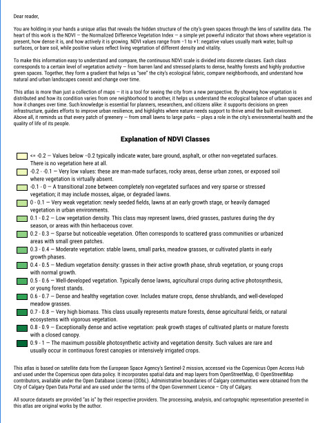 Calgary Greenness Atlas (Green Color Edition) is a unique geo-ecological atlas that reveals the distribution and condition of vegetation in the northwest sector of Calgary, based on Sentinel-2 satellite data. Built around the NDVI β the Normalized Difference Vegetation Index, one of the key indicators of vegetation density and activity β this atlas combines spatial analysis with clear visual storytelling to provide an in-depth view of the cityβs green structure and how it varies across communities.